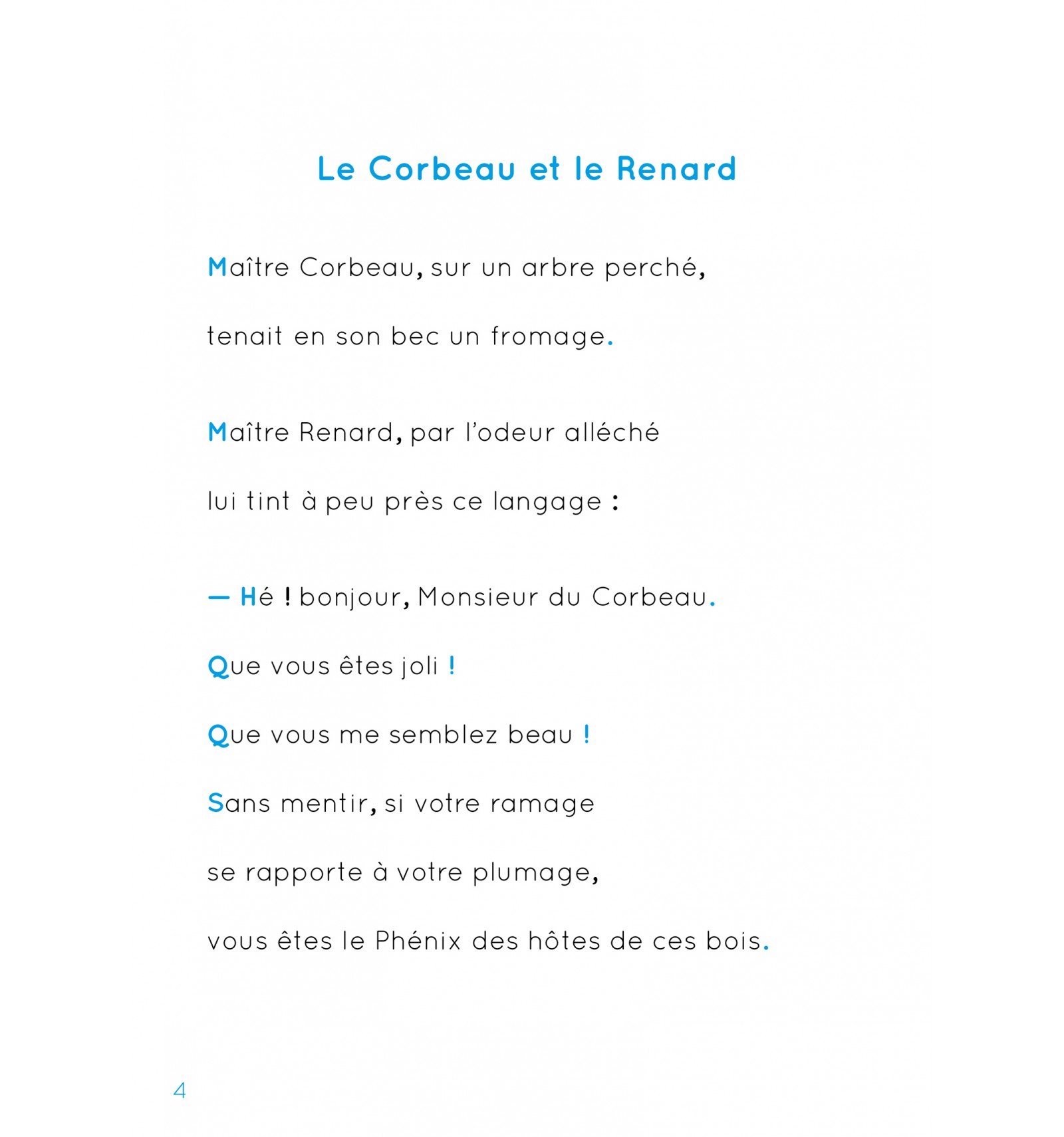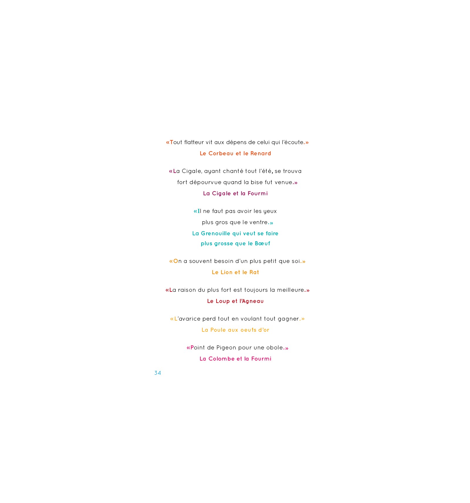 Le Corbeau et le Renard - La Cigale et la Fourmi - La Grenouille qui veut se faire aussi grosse que le Boeuf - Le Lion et le Rat - Le Loup et l'Agneau - La Poule aux oeufs d'or - La Colombe et la Fourmi